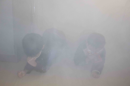 体育倉庫室で煙体験を行いましたが 煙で前が見えずびっくりしていたよう です。 今回の体験を生かして、1番大切な 「いのち」を大切にする行動がとれる よう今後も地域や学校で行う防災・消 火訓練などに参加してほしいです。